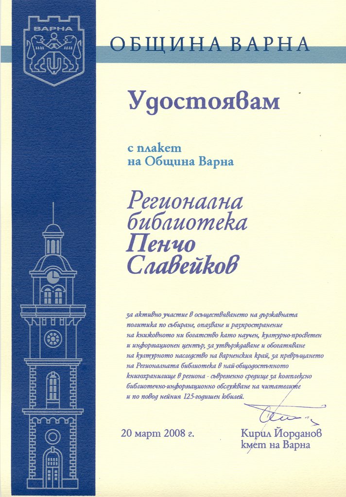 Висока оценка за дейността, значението и мястото и в културния живот на града библиотеката получава с поздрава от Общински съвет Варна – почетен знак и от Община Варна – грамота и плакет на кмета на града. Посланието на Кирил Йорданов към колектива на Регионална библиотека „Пенчо Славейков” е признание за смисъла, движил усилията на поколения библиотечни дейци.
