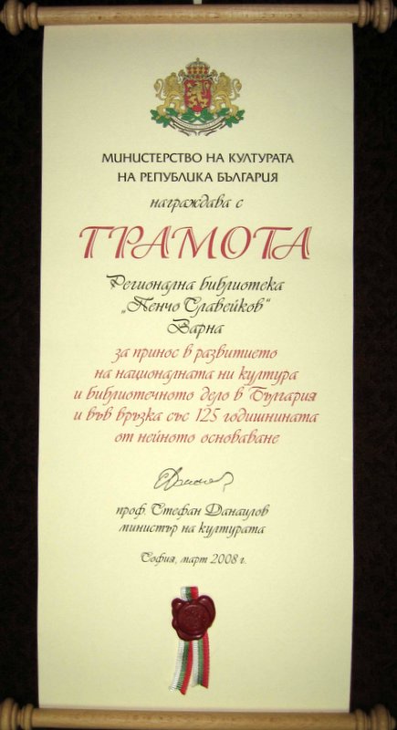 Със „За многая лета” започва тържествената среща с приятели и гости на Варненската библиотека в зала „Пленарна”. Зам. министърът на културата Надежда Захариева поздравява библиотеката и я награждава с грамота и плакет на Министерство на културата за цялостен принос в развитието и популяризирането на българската култура. Изненада за празника са цветята, изпратени от министъра на културата проф. Стефан Данаилов.