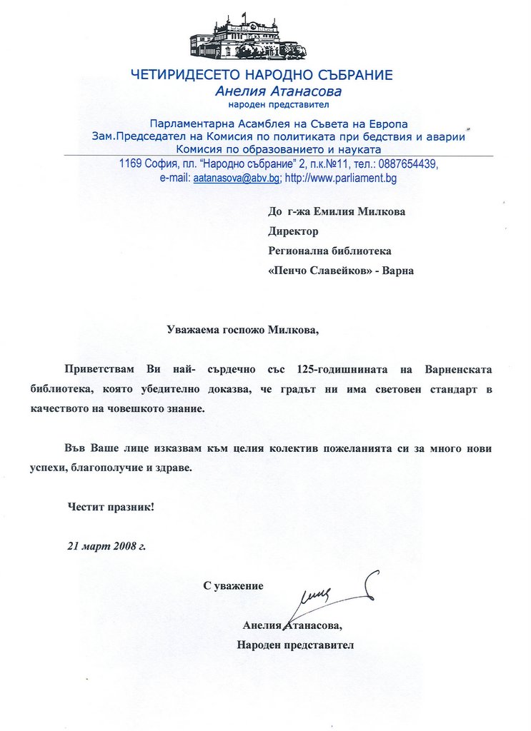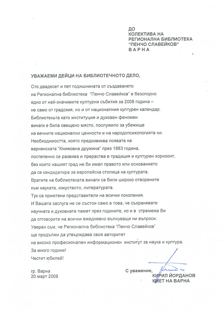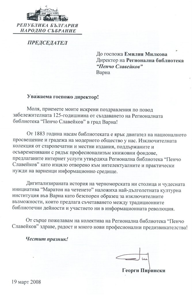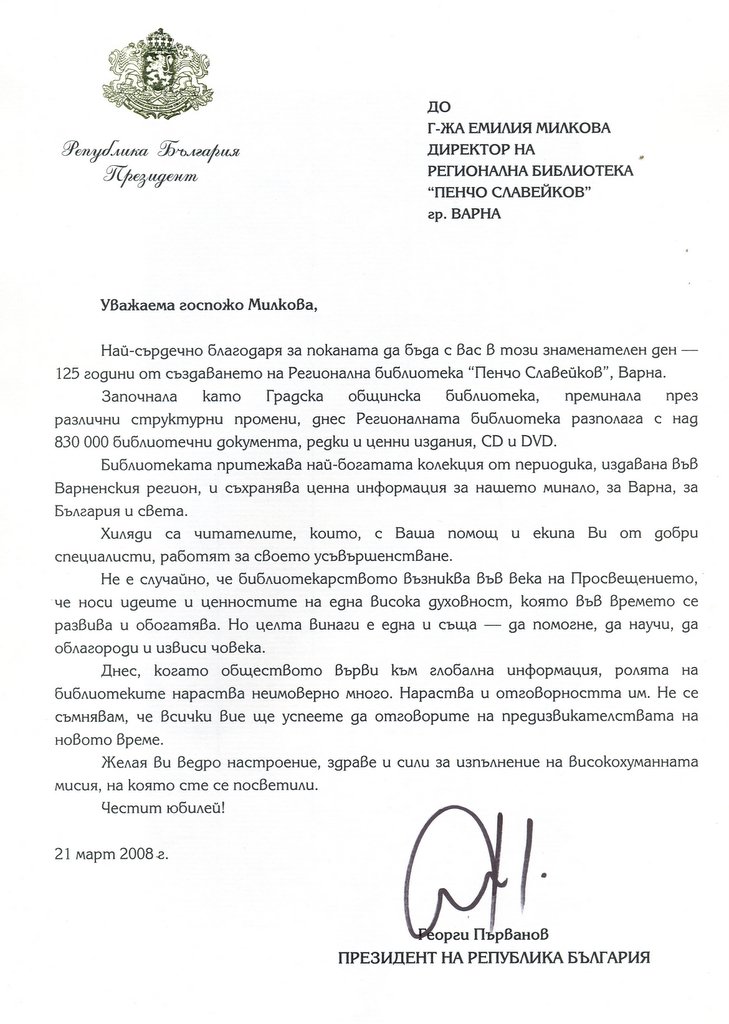 „…библиотекарството…носи идеите и ценностите на една висока духовност, която във времето се развива и обогатява. Но целта винаги е една и съща – да помогне, да научи, да облагороди и извиси човека…Не се съмнявам, че вие ще успеете да отговорите на предизвикателствата на новото време…Честит юбилей!” се казва в поздравителния адрес от президента Георги Първанов, получен на 21-ви март.