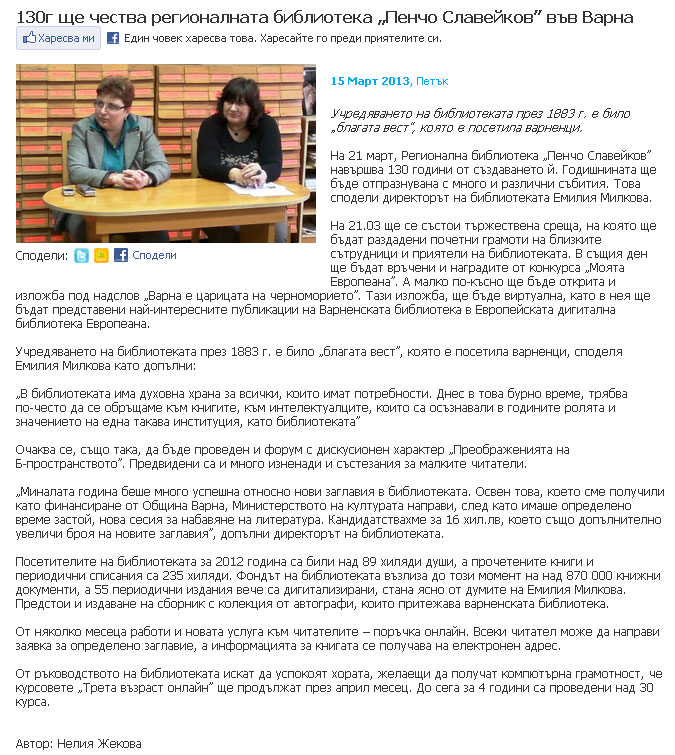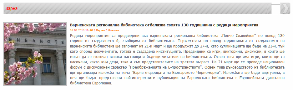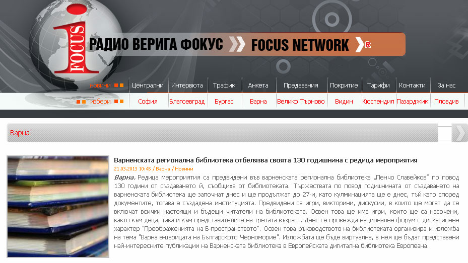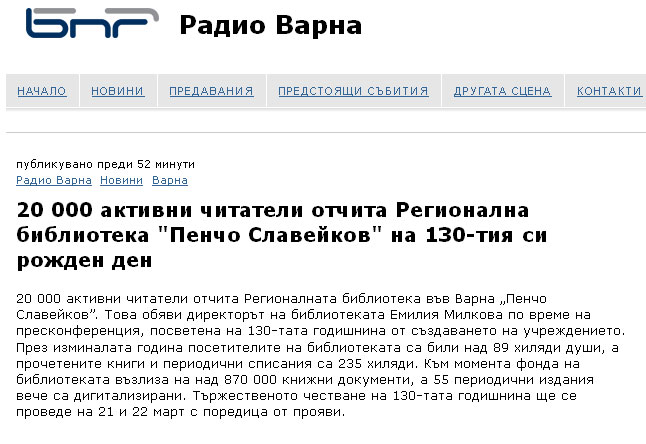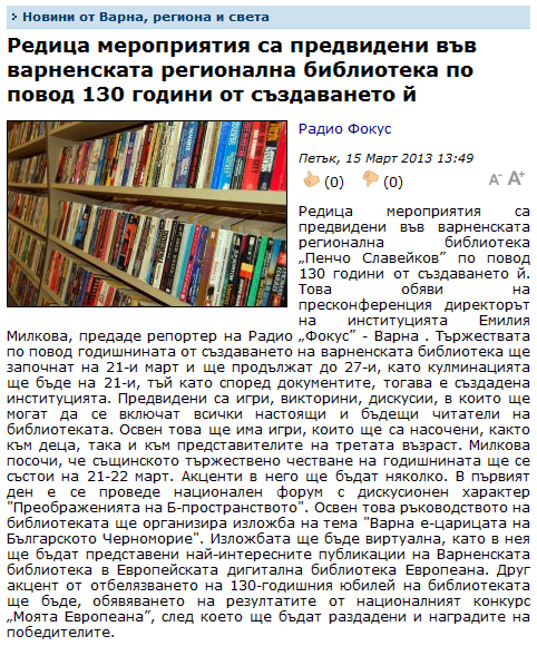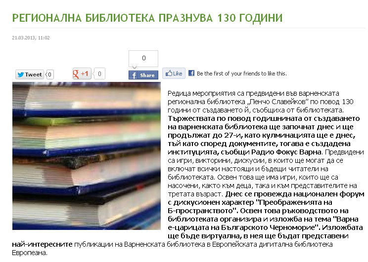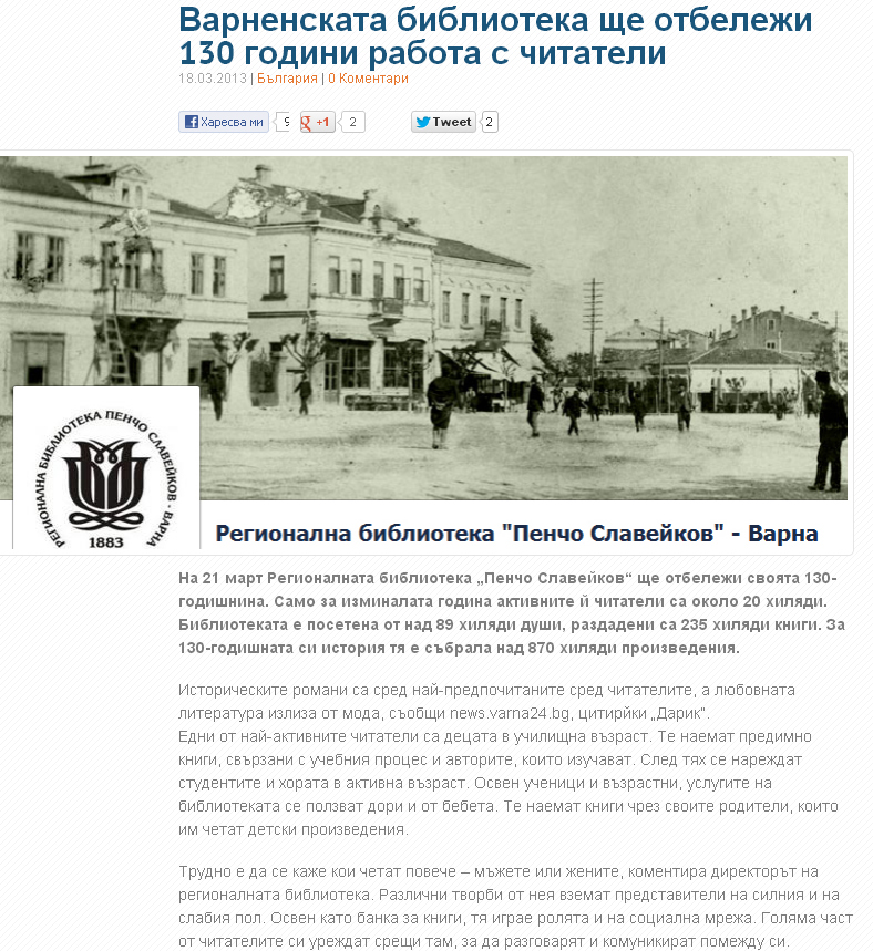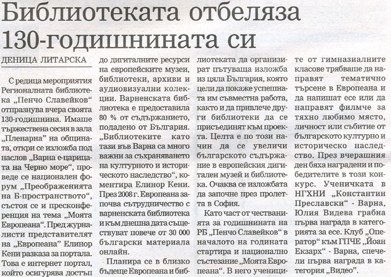 Отзиви в медиите по повод 130 годишнината на Регионална библиотека "Пенчо Славейков"