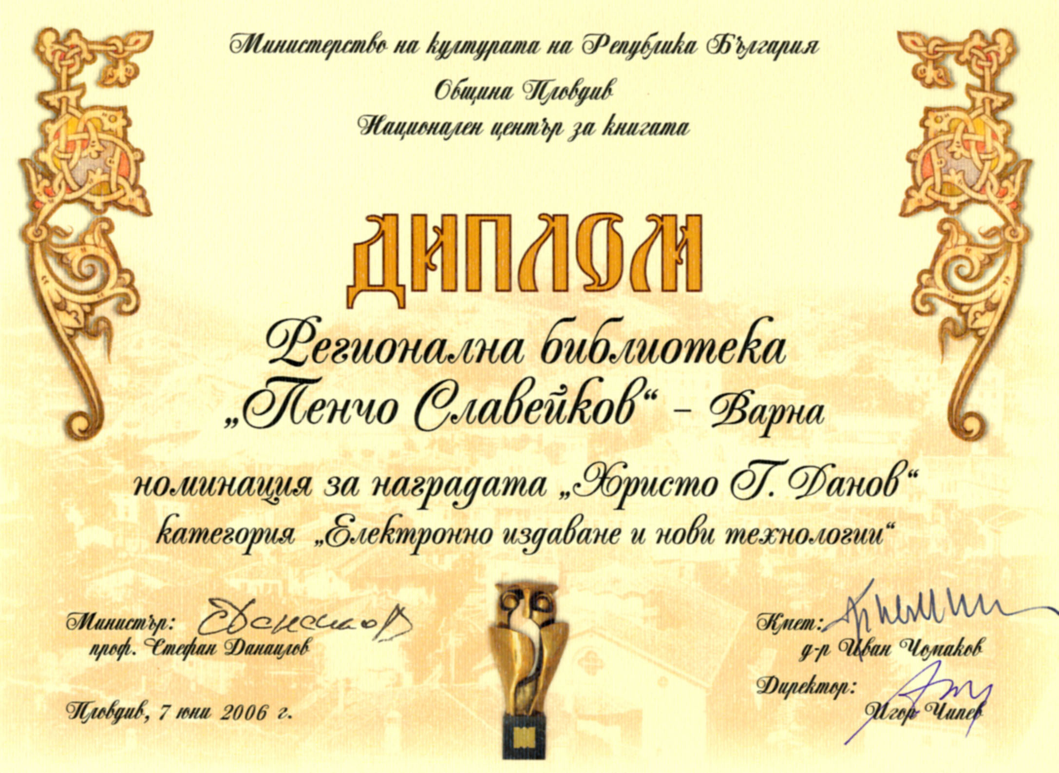 В град Пловдив Регионална библиотека "Пенчо Славейков" - Варна получи Националната награда "Христо Г. Данов" в категорията "Библиотеки и библиотечно дело".