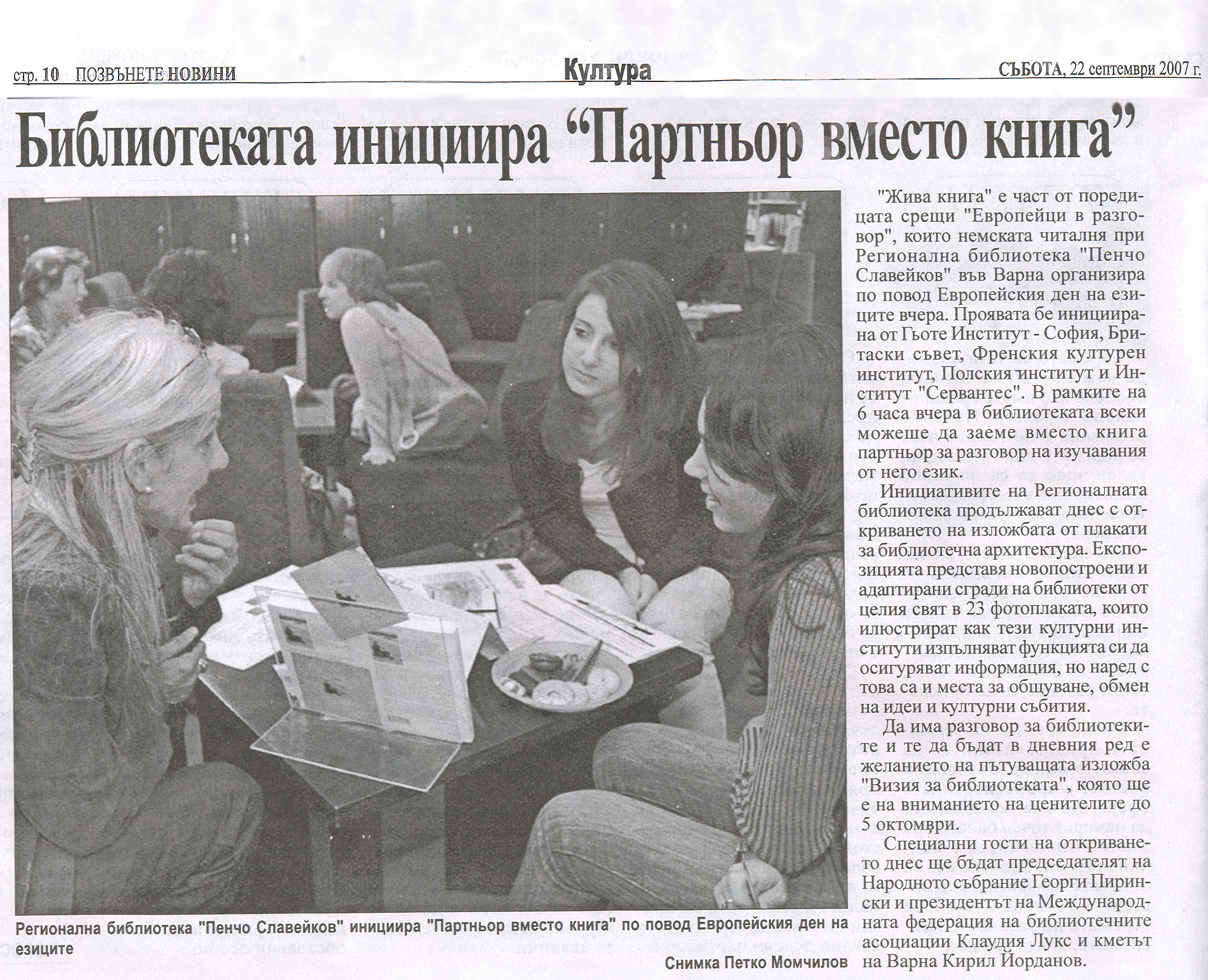 Инициативата е подкрепена от културните институти на страните членки на ЕС. Посетителите имаха уникалната възможност да си заемат не книга от библиотеката, а партньор за разговор на чужд език.
