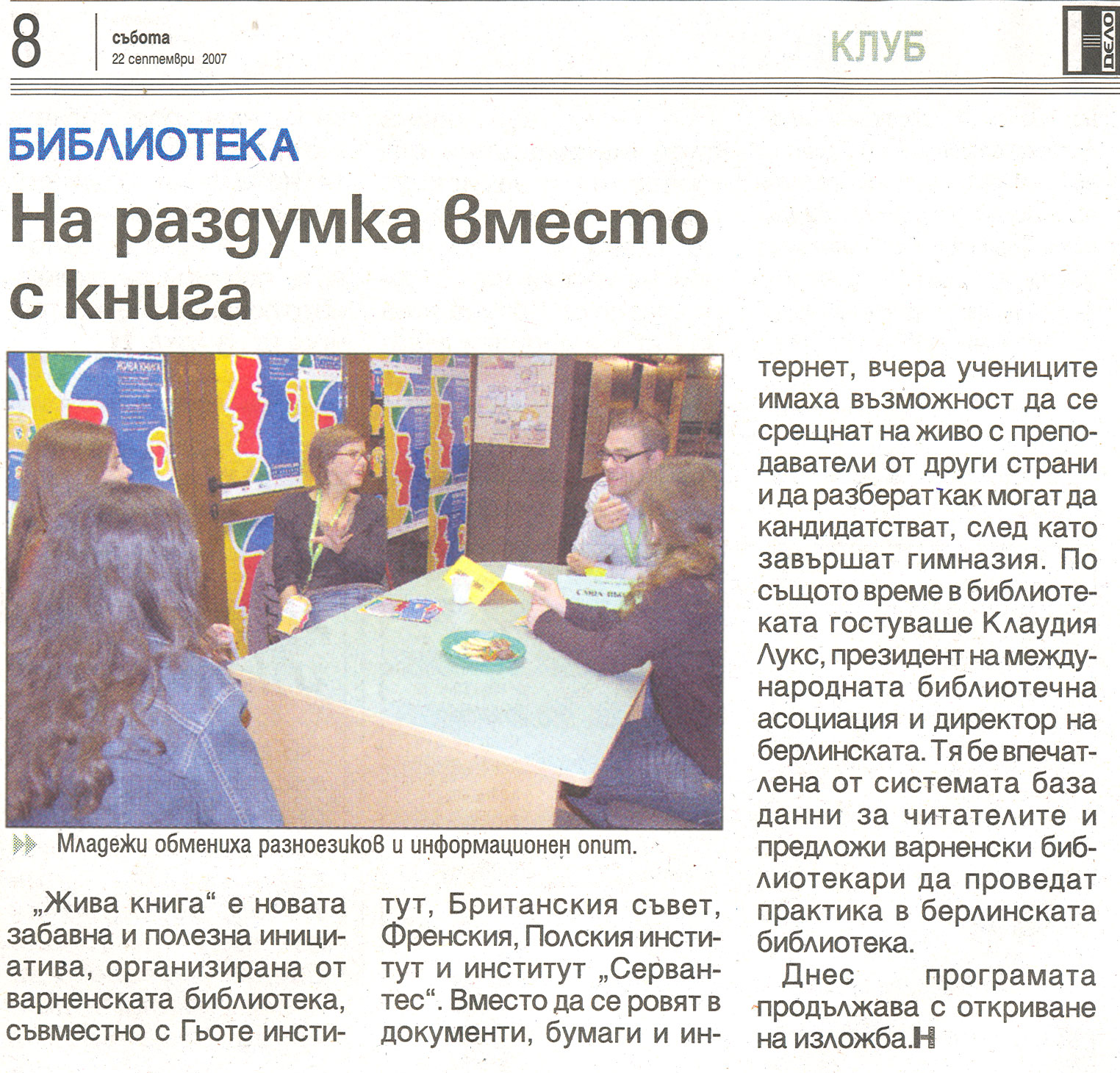 със серия срещи "Европейци в разговор": "Жива книга" - съвместна инициатива на Немска читалня, Гьоте институт - България, Британски, Френски и Полски културни институти.