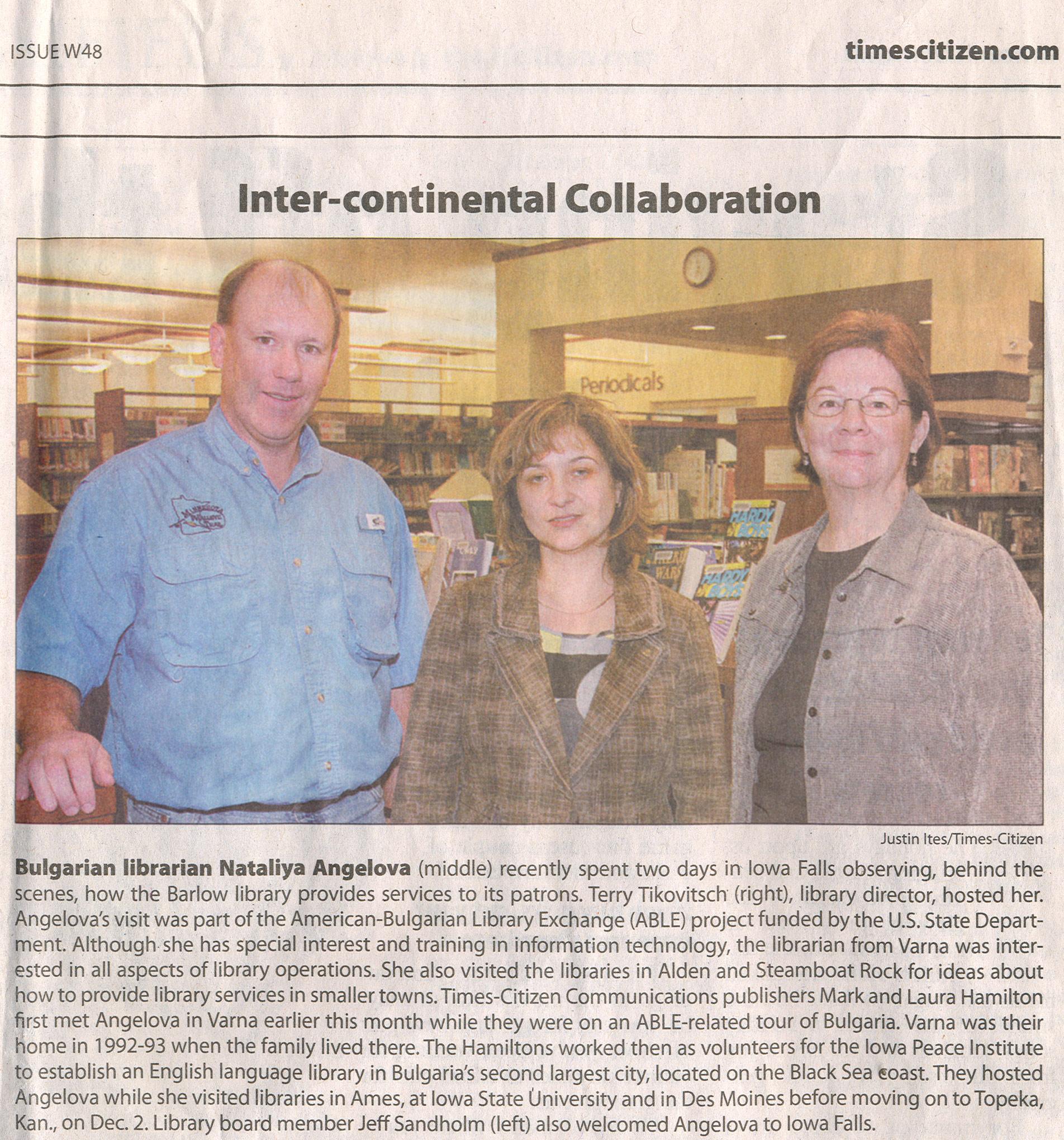 Във всички библиотеки ми бе предоставена възможността да разкажа за България, Варна, библиотечната система в страната и Регионална библиотека „Пенчо Славейков”. Навсякъде срещнах голям интерес към нашата културата и живот. Имах срещи с българи живеещи и работещи в Еймс, за които беше много приятно да си поговорят на български.