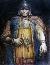 боево снаряжение. В едната си ръка той държи подпрян на земята щит, в другата