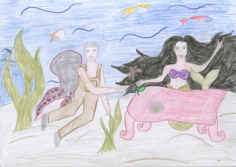стигнал до огромна зала. Това били покоите на морската вещица. -Знам за какво си дошъл - рекла тя. -Искаш морското цвете, за да спасиш принцесата. Добре, ще го получиш, ако ми намериш морския диамант и ми го донесеш. |