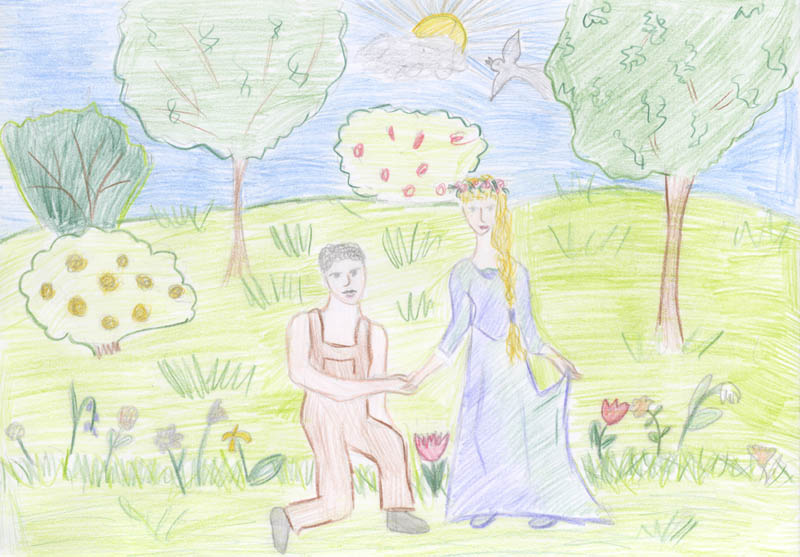 Момчето засадило дървото на живота, златния храст и морското цвете. Щом го направило, се издигнала чудна градина с десетки различни растения. Преливали се най-красивите нюанси на зеленото, носел се аромат на лилии и рози. Дървета с прекрасни корони се извисявали и хвърляли сянка върху свежите треви. Градинарят поставил фонтана в средата на градината и той веднага се превърнал в чудно хубава девойка. Тя имала златна като слънцето коса и греещи като звездици очи. Лицето й било бяло и нежно, а роклята, в която била облечена, се сливала с красотата на градината. Момъкът се влюбил в нея от пръв поглед. |