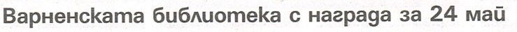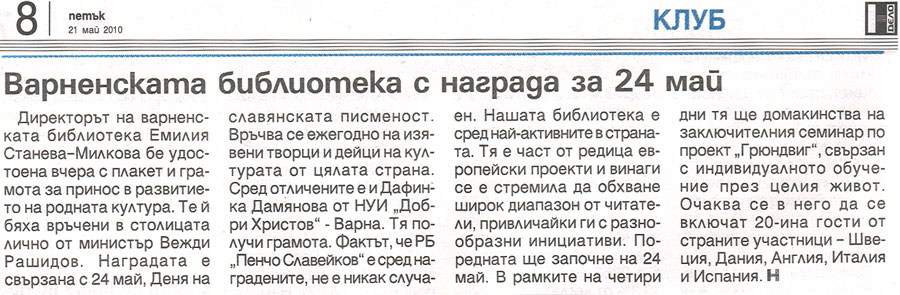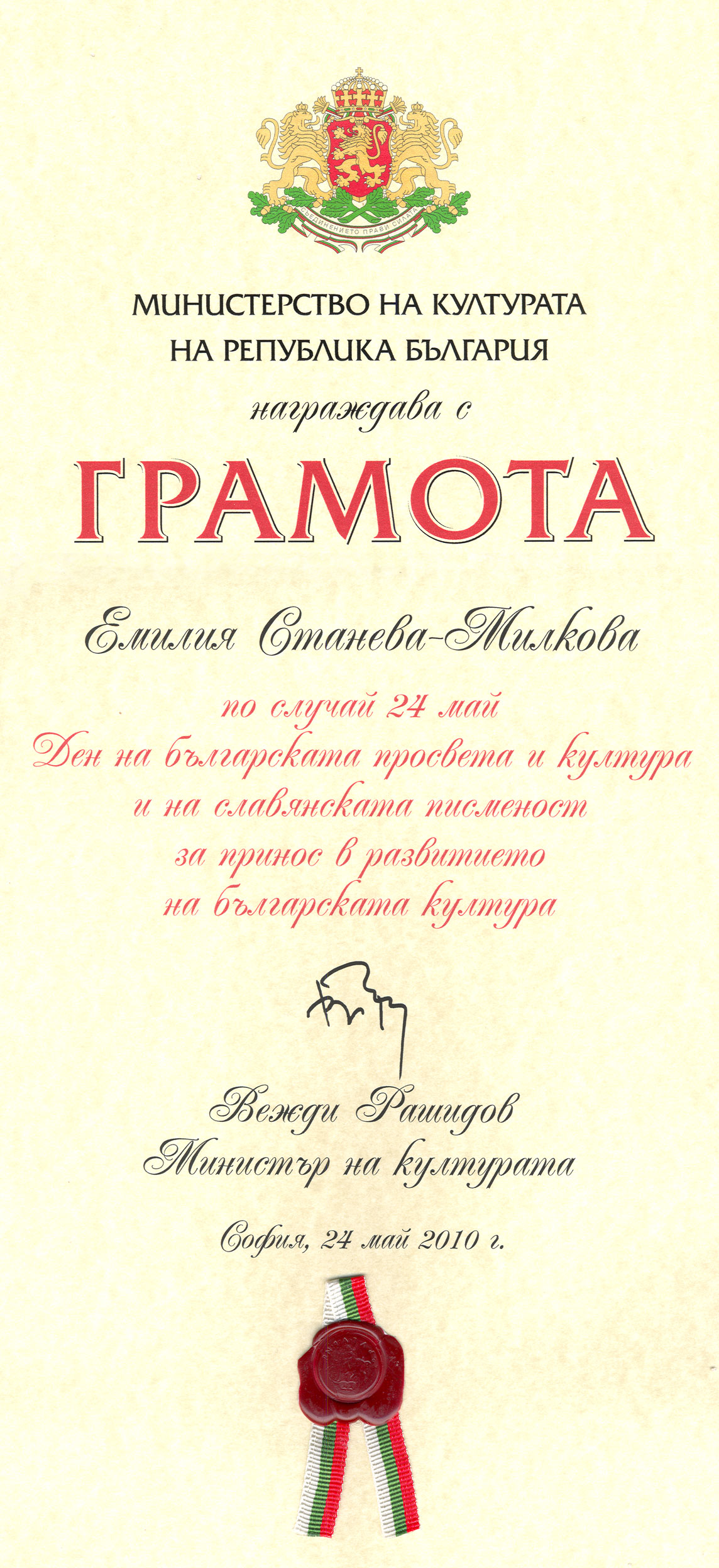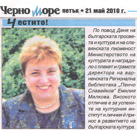 С радост и удовлетворение ви съобщаваме, че по повод 24 май - деня на българската просвета и култура и на славянската писменост, госпожа Емилия Милкова – директор на Регионална библиотека „Пенчо Славейков” бе наградена от Министерство на културата с плакет и грамота за принос в развитието на българската култура.