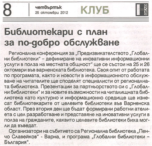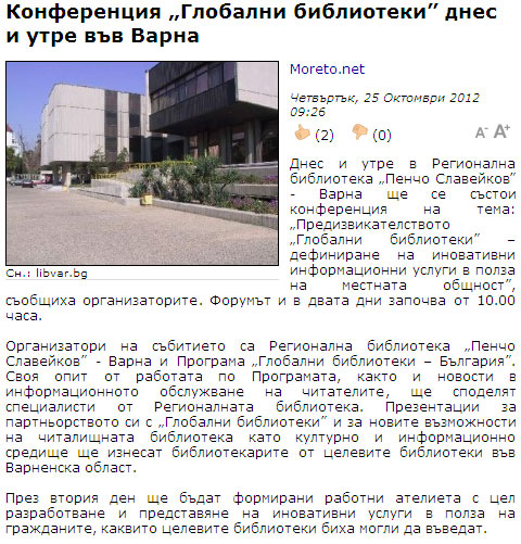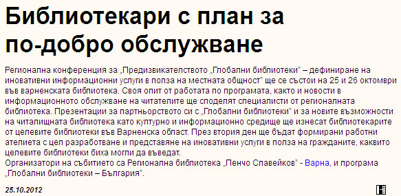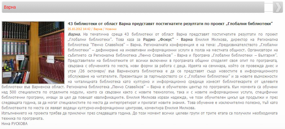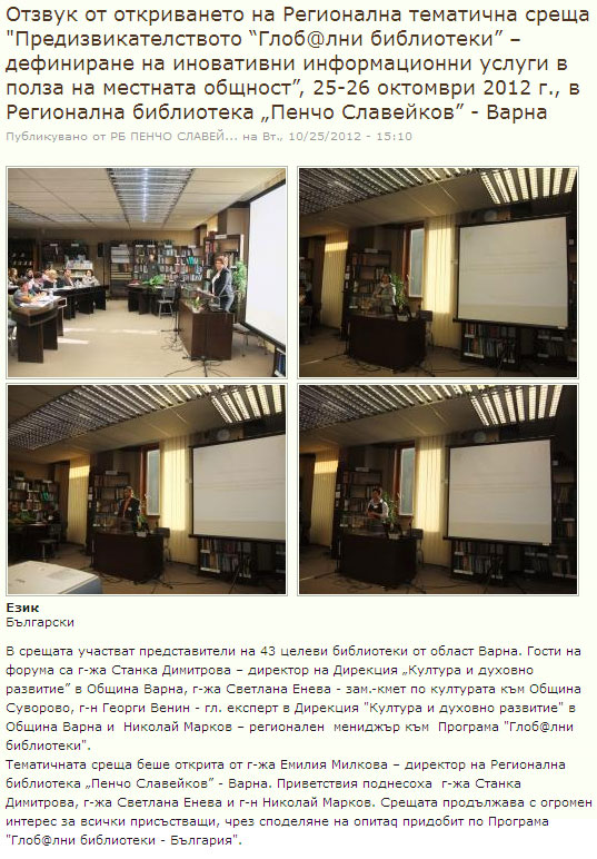Репортаж за откриването на Регионална тематична среща "Предизвикателството "Глоб@лни библиотеки" - дефиниране на иновативни информационни услуги в полза на местната общност"
