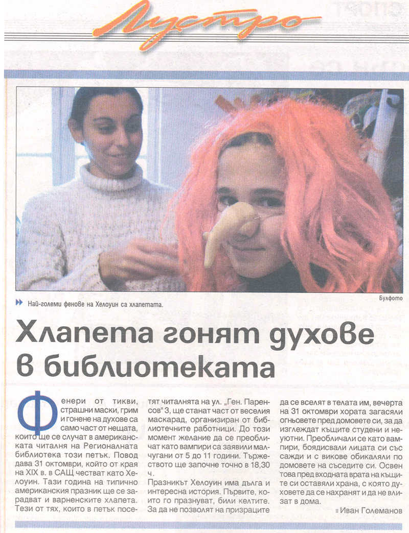 ГОЛЕМАНОВ, Иван. Хлапета гонят духове в библиотеката / Иван Големанов. // Н а р. д е л о (Варна), LXIV, N 248, 29 окт. 2008, с. 32.