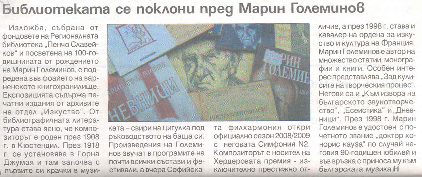 1. БИБЛИОТЕКАТА се поклони пред Марин Големинов. // Н а р. д е л о (Варна), LXIV, N 226, 3 окт. 2008, с. 8. Изложба в РБ "Пенчо Славейков", посветена на 100-годишнината от рождението на композитора.