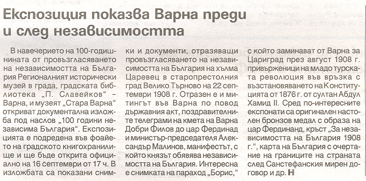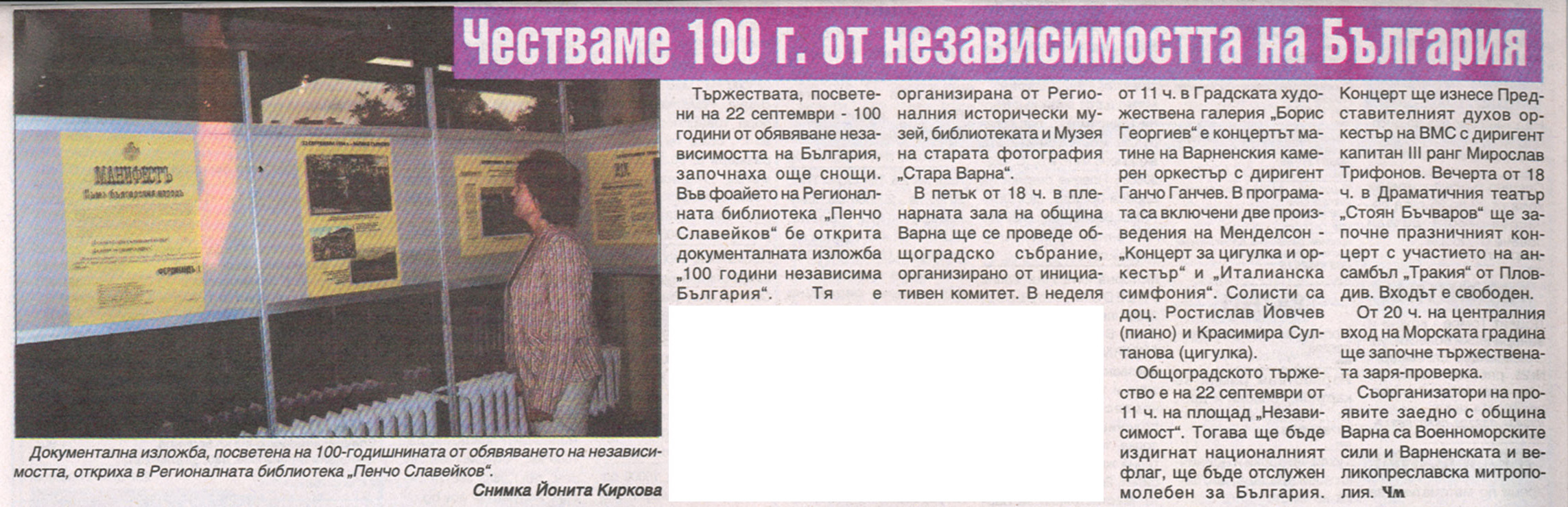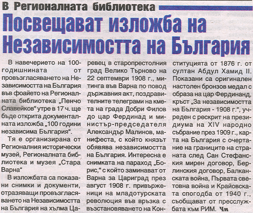 ПОСВЕЩАВАТ изложба на Независимостта на България. : В Регионалната библиотека // Ч е р н о м о р е (Варна), IХ, N 207, 16 септ. 2008, с. 16.