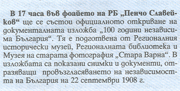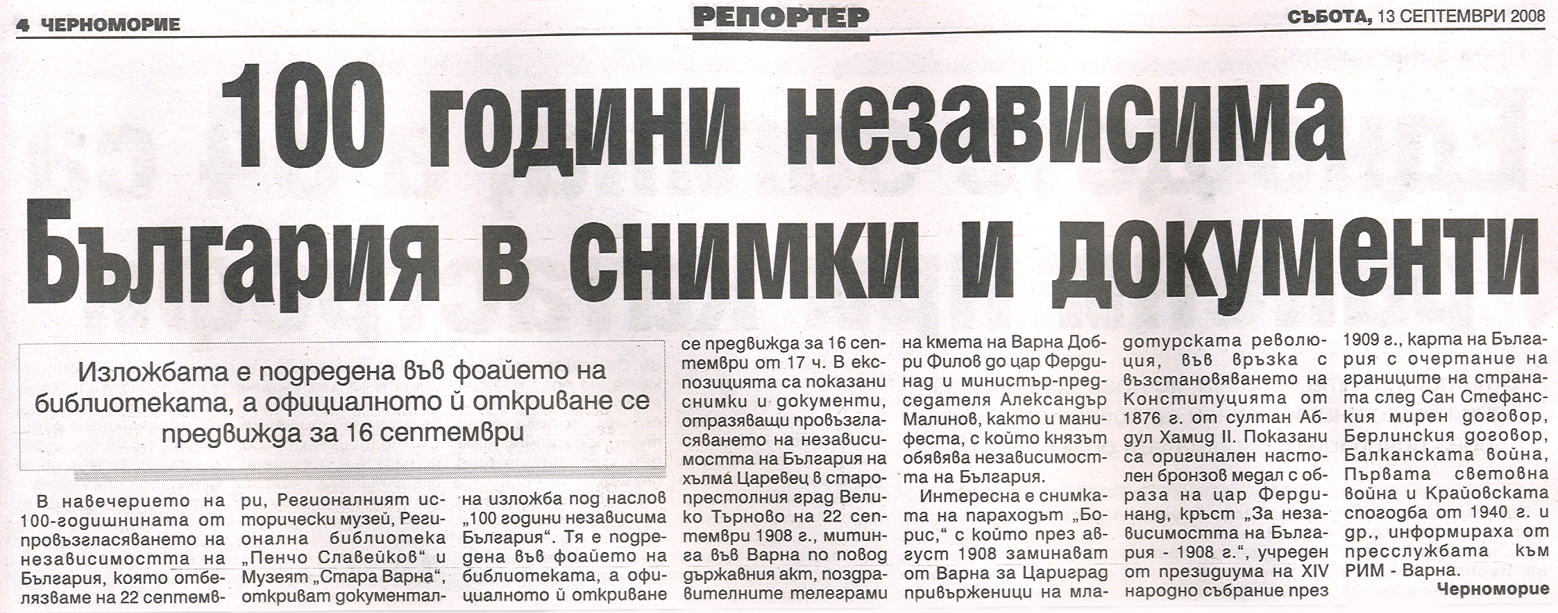 [СТО] 100 години независима България в снимки и документи : Изложбата е подредена във фоайето на библиотеката, а официалното й откриване се предвижда за 16 септември // Ч е р н о м о р и е (Варна), XVIII, N 208, 13 септ. 2008, с. 4. |