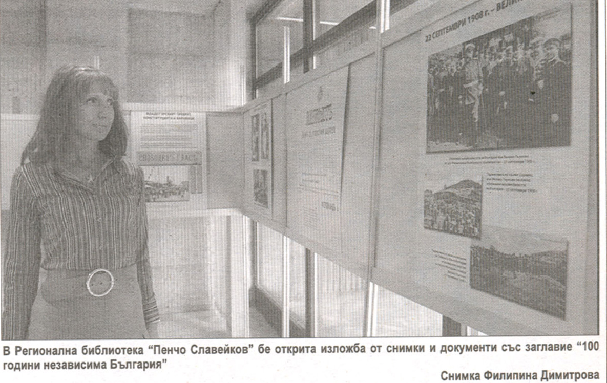 Документалната изложба "100 години независима България" е подредена във фоайето на Регионалната библиотека "Пенчо Славейков" със съдействието на Регионалният исторически музей и Музеят на старата фотография.