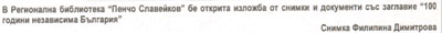 ДИМИТРОВА, Филипина. В Регионална библиотека "Пенчо Славейков" бе открита изложба от снимки и документи със заглавие "100 години независима България" : [Снимка] / Филипина Димитрова. // П о з в ъ н е т е Н о в и н и (Варна), ХV, N 223, 17 септ. 2008, с. 4. |