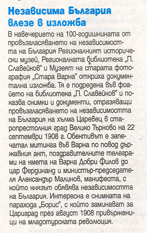 НЕЗАВИСИМА България влезе в изложба. // М о р с к и д н е в н и к (Варна), IV, N 37, 19-25 септ. 2008, с. 4.