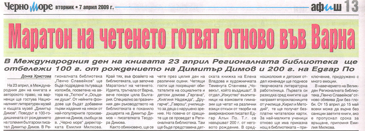 1. ХРИСТОВА, Донка. Маратон на четенето готвят отново във Варна : В Международния ден на книгата 23 април Регионалната библиотека ще отбележи 100 г. от рождението на Димитър Димов и 200 г. на Едгар По / Донка Христова. // Ч е р н о м о р е (Варна), Х, N 78, 7 апр. 2009, с. 13.