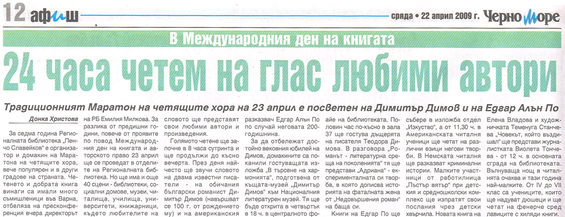 2. ХРИСТОВА, Донка. 24 часа четем на глас любими автори : Традиционният Маратон на четящите хора на 23 април е посветен на Димитър Димов и на Едгар Алън По / Донка Христова. // Ч е р н о м о р е (Варна), Х, N 90, 22 апр. 2009, с. 12. В Международния ден на книгата.