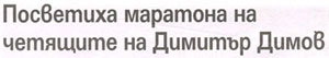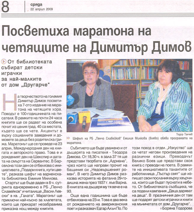 3. ТОДОРОВА, Боряна. Посветиха маратона на четящите на Димитър Димов : От библиотеката събират детски играчки за най-малките от дом "Другарче" / Бoряна Тодорова. // Н а р. д е л о (Варна), LXV, N 90, 22 апр. 2009, с. 8. Инициативата на РБ "П. Славейков" - Маратон на четенето.
