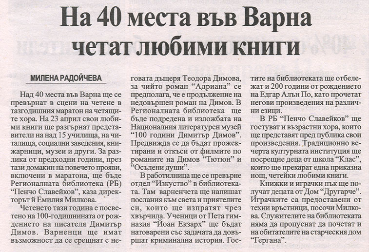 4. РАДОЙЧЕВА, Милена. На 40 места във Варна четат любими книги / Милена Радойчева. // П о з в ъ н е т е н о в и н и (Варна), ХVI, N 93, 22 апр. 2009, с. 3. Във връзка с инициативата на РБ "Пенчо Славейков" - "Маратон на четенето".