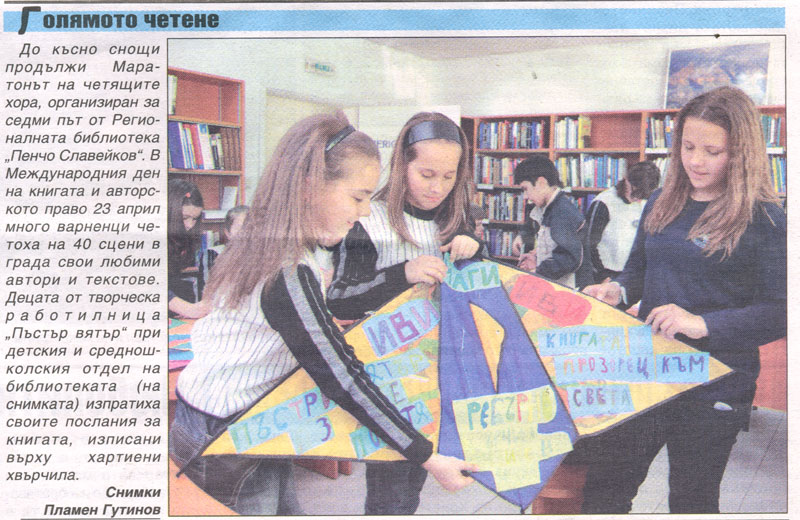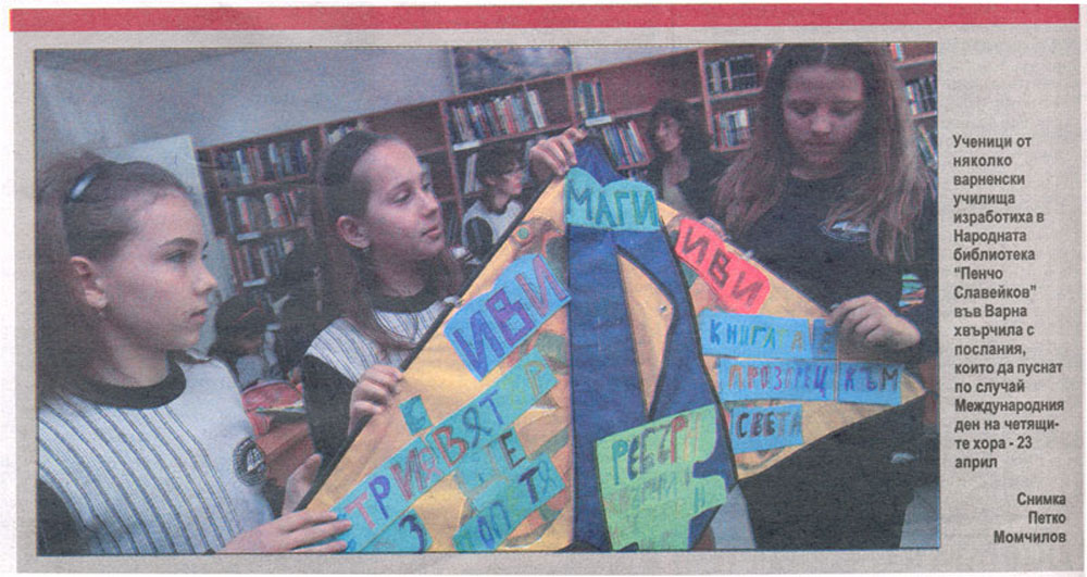 6. [МАРАТОН на четящите хора `2009] : [Снимка] // П о з в ъ н е т е Н о в и н и (Варна), XVI, N 95, 24 апр. 2009, с. 1. Деца изработват хвърчила с послания в Регионална библиотека "Пeнчо Славейков".