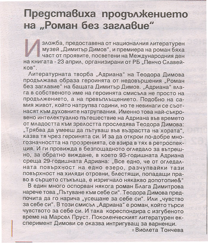 7. ТОНЧЕВА, Виолета. Представиха продължението на "Роман без заглавие" / Виолета Тончева. // Н а р. д е л о (Варна), LXV, N 92, 24 апр. 2009, с. 8. Среща с писателката Теодора Димова - част от инициативите на Регионална библиотека "П. Славейков" в Международния ден на книгата - 23 април. Маратон на четящите хора, посветен на 100 г. от рождението на Димитър Димов.