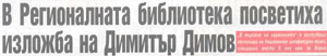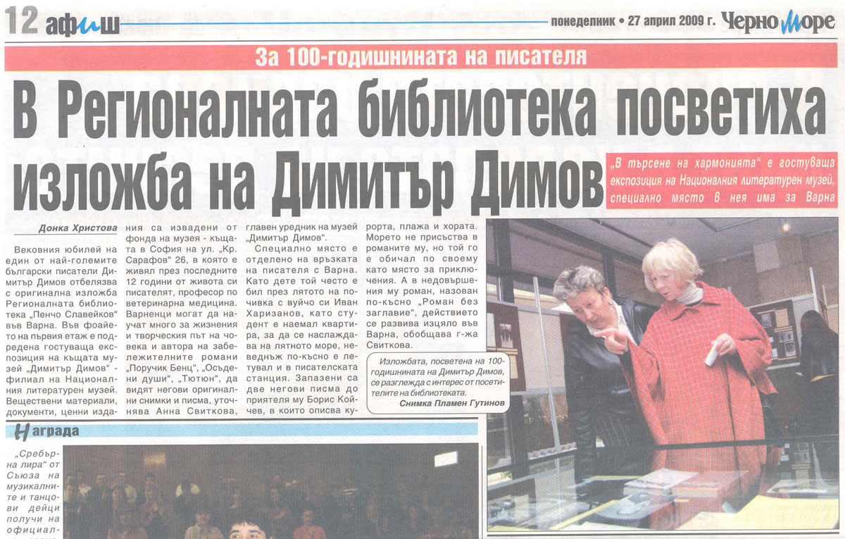 8. ХРИСТОВА, Донка. В Регионалната библиотека посветиха изложба на Димитър Димов : "В търсене на хармонията" е гостуваща експозиция на Националния литературен музей, специално място в нея има и за Варна / Донка Христова. // Ч е р н о м о р е (Варна), X, N 94, 27 апр. 2009, с. 12.