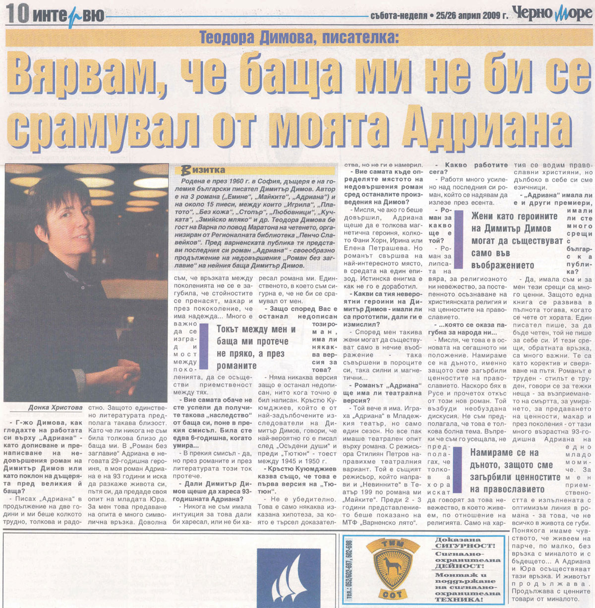 9. ДИМОВА, Теодора. Вярвам, че баща ми не би се срамувал от моята Адриана / Теодора Димова; [Интервю взе] Донка Христова. // Ч е р н о м о р е (Варна), X, N 93, 25/26 апр. 2009, с. 10. Писателката е гост на Регионална библиотека "П. Славейков" - Варна в Международния ден на книгата, посветен на 100-годишнината от рождението на Димитър Димов.