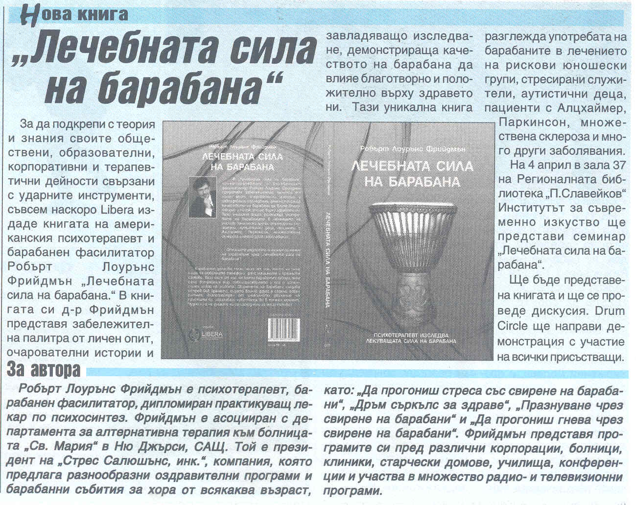 МЛАДЕНОВА, Татина. "Лечебната сила на барабана" / Татина Младенова. // Ч е р н о м о р е (Варна), X, N 75, 3 апр. 2009, с. 14.