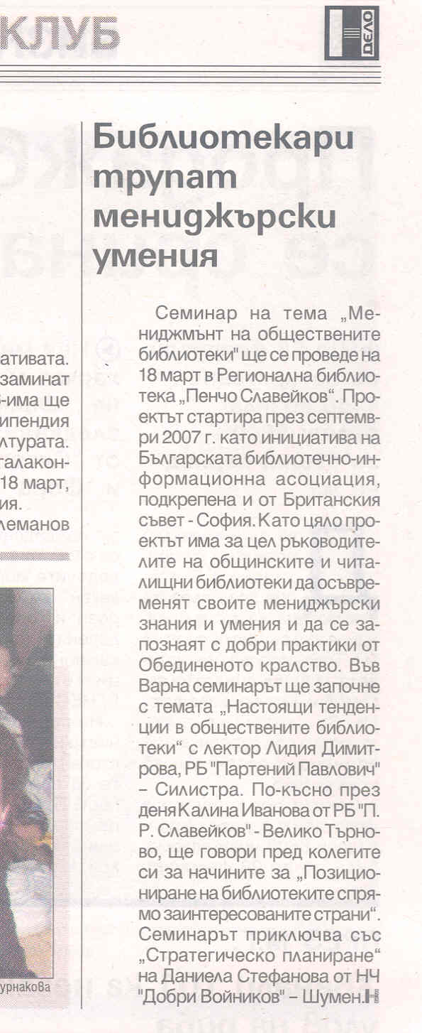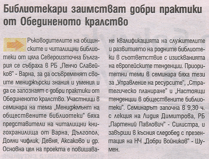 Семинар" Мениджмънт на обществените библиотеки", проведен със съдействие на Британски съвет в Регионална библиотека П. Славейков.