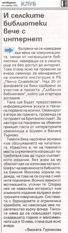 1. ГУРНАКОВА, Виолета. И селските библиотеки вече с интернет / Виолета Гурнакова. // Н а р. д е л о (Варна), LXV, N 271, 26 ноем. 2009, с. 8. Семинар за мениджмънт на книжните институции в РБ "Пенчо Славейков" по проект "Глобални библиотеки".