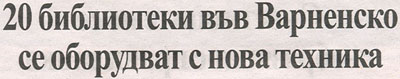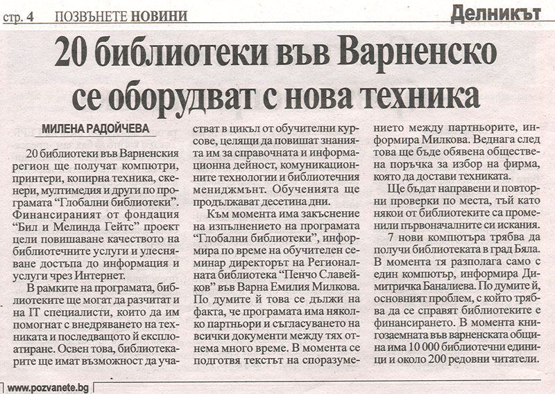 2. РАДОЙЧЕВА, Милена. 20 библиотеки във Варненско се оборудват с нова техника / Милена Радойчева. // П о з в ъ н е т е н о в и н и (Варна), ХVI, N 280, 26 ноем. 2009, с. 4. По програма "Глобални библиотеки".