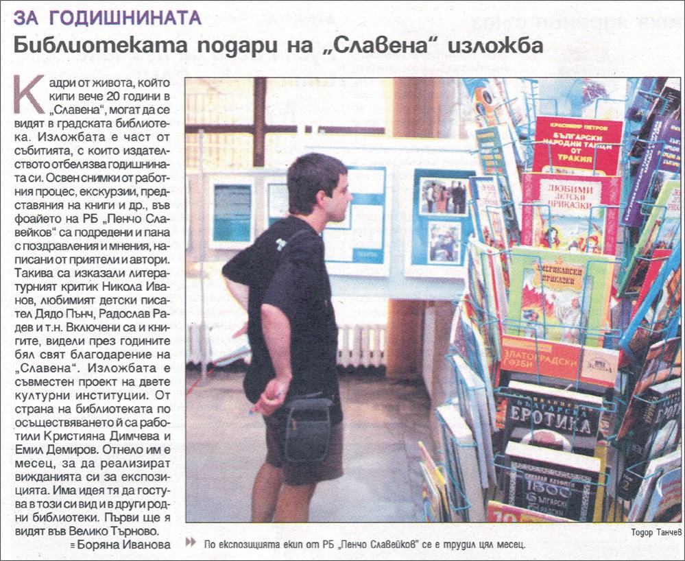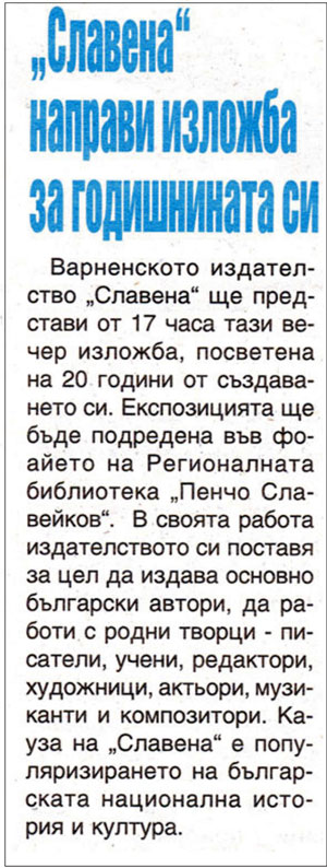 2. ИВАНОВА, Боряна. Библиотеката подари на "Славена" изложба : За [20] годишнината / Боряна Иванова. // Н а р. д е л о (Варна), LXVI, N 155, 8 юли 2010, с. 10.