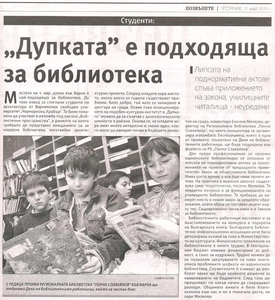 1. РАДОЙЧЕВА, Милена. "Дупката" е подходяща за библиотека / Милена Радойчева. // П о з в ъ н е т е (Варна), [XVII], N 110, 11 май 2010, с. 2.