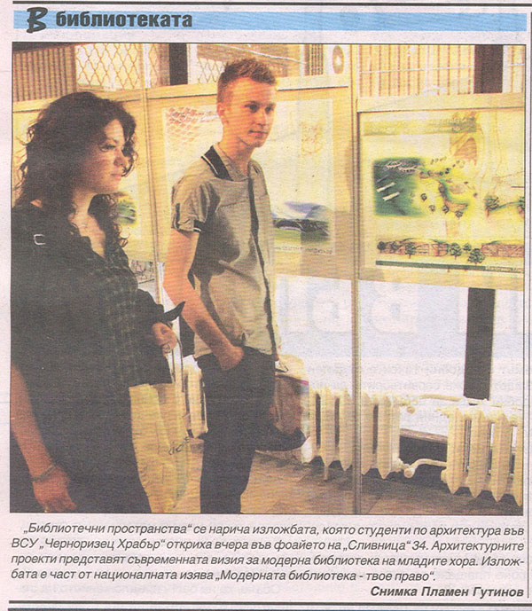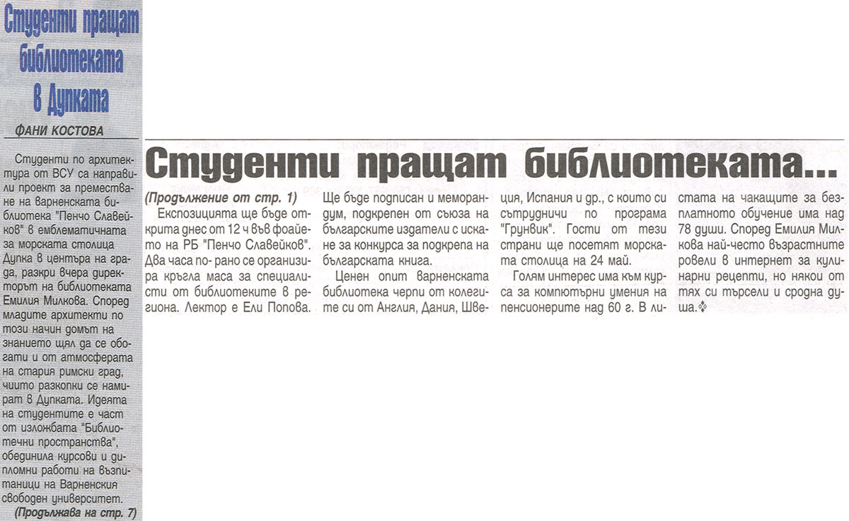 2. КОСТОВА, Фани. Студенти пращат библиотеката в Дупката / Фани Костова. // Т в о я т д е н (Варна), N 89, 11 май 2010, с. 1, 7. По повод изложбата "Библиотечни пространства" в РБ "Пенчо Славейков".