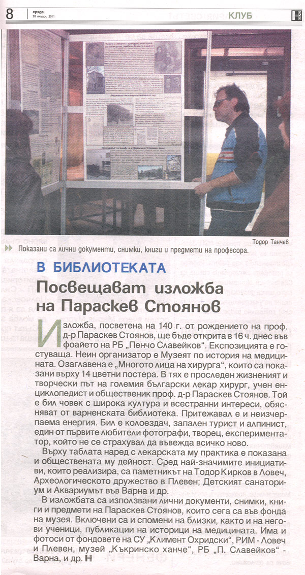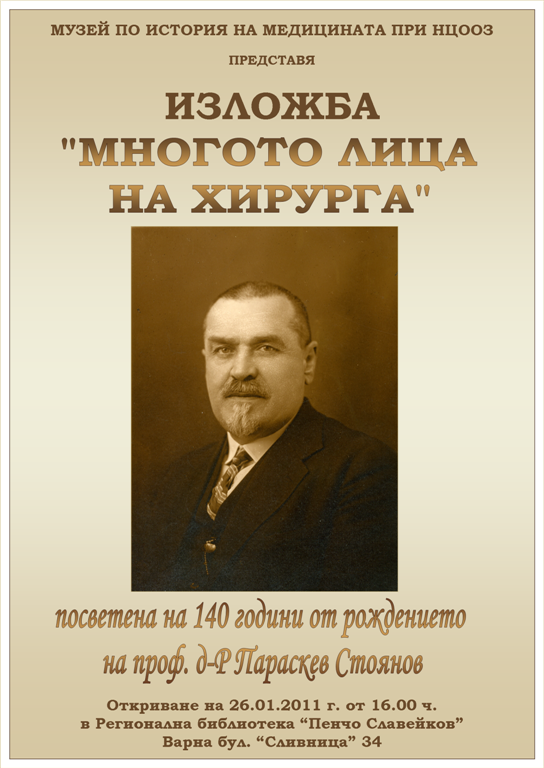 Върху 14 цветни постера е проследен жизнения и творчески път на големия български лекар-хирург, учен-енциклопедист и общественик проф. д-р Параскев Стоянов. Човек с широка култура и всестранни интереси, в живота му водеща е работата му като хирург. Наред с лекарската е показана обществената му дейност. Сред най-значимите инициативи, които реализира, са: паметника на Тодор Кирков в Ловеч, Археологическото дружество в Плевен; Детския санаториум и Аквариума във Варна и др.