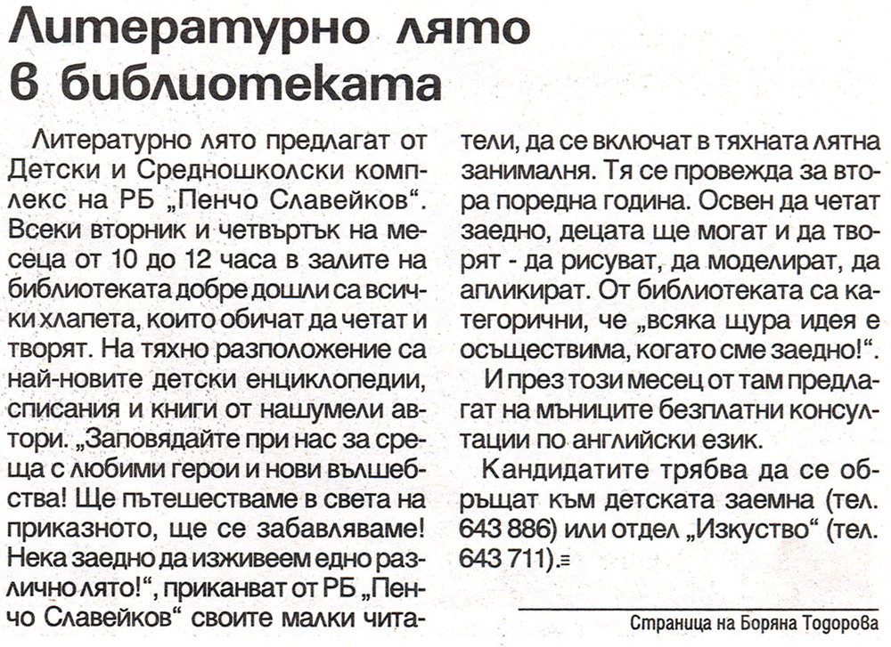 ТОДОРОВА, Боряна. Литературно лято в библиотеката / Боряна Тодорова. // Народно дело (Варна), LXVII, N 154, 12 юли 2011, с. 8.