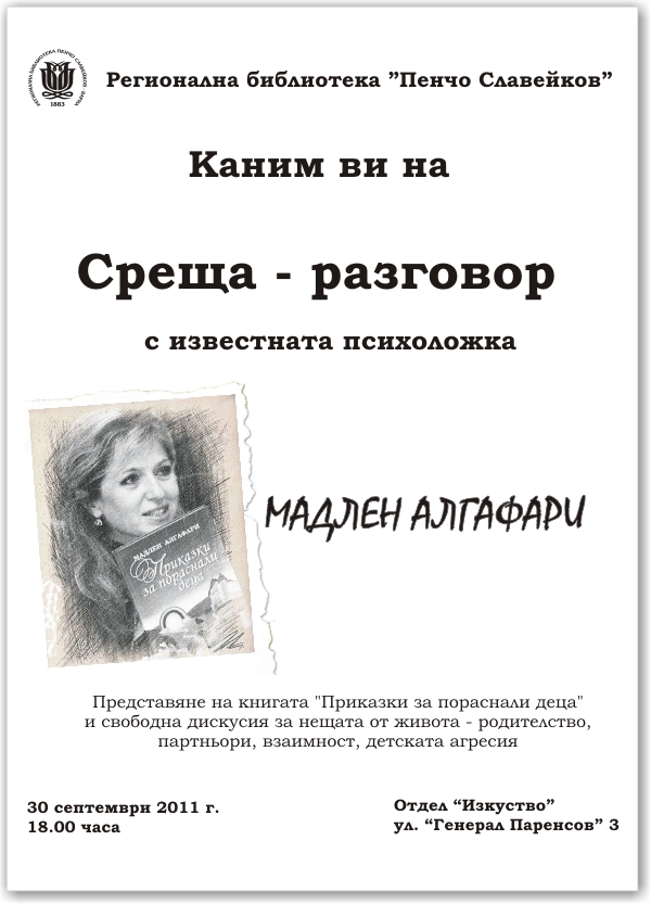 Почитателите на Мадлен Алгафари изпълниха залите на отдел "Изкуство", очаквайки да срещнат своя любим писхолог и автор. Разговорът бе емоционален и разнороден, засягащ темите за възпитанието на децата, борбата срещу гнева и агресията, позитивното мислене и книгите на Алгафари (излезли и предстоящи). В края на вечерта участниците си тръгнаха с автографи на авторката, откривайки позабравеното в себе си пораснало дете. |