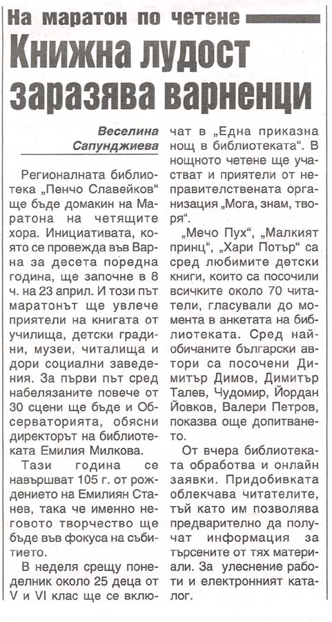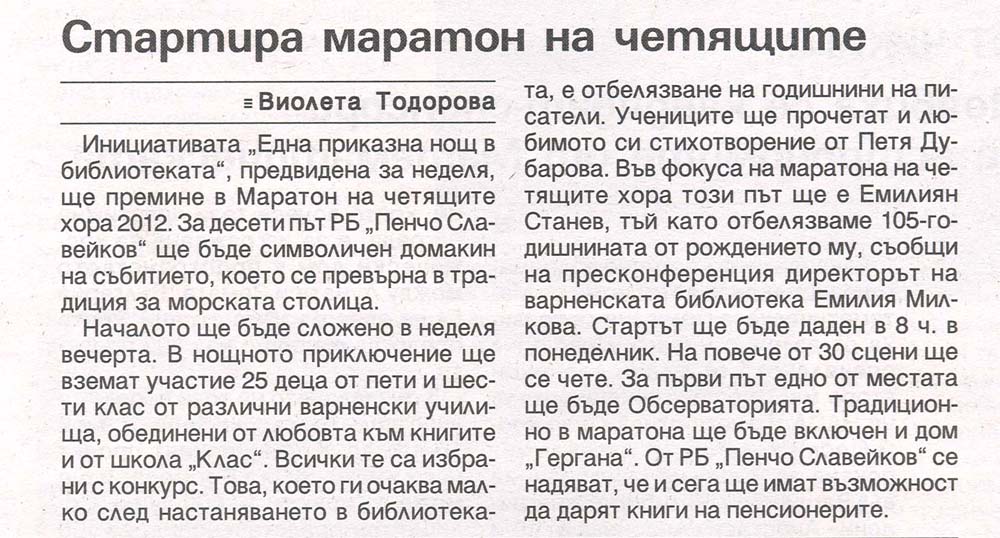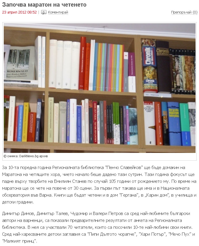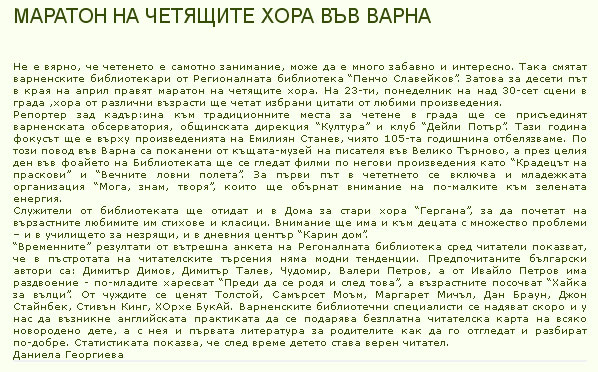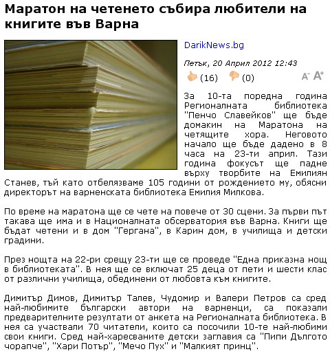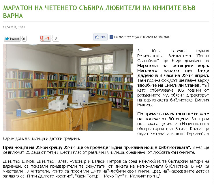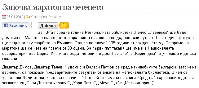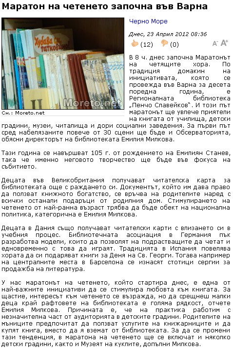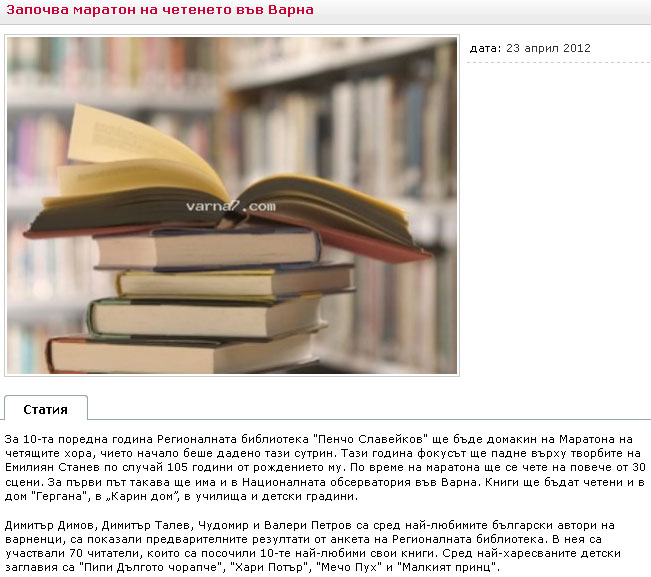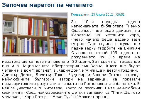 Маратон на четящите хора във Варна // More.bnt.bg [електронен ресурс], 20 април 2012