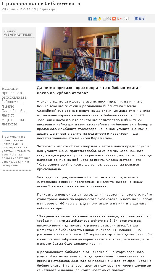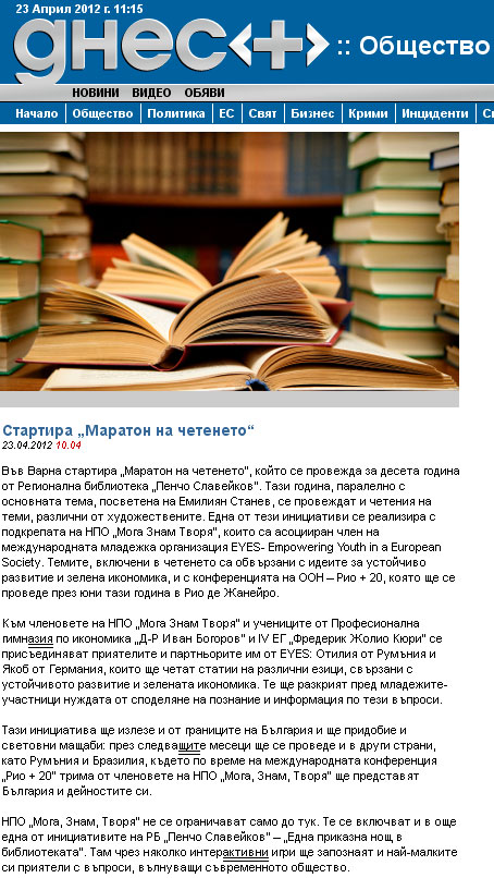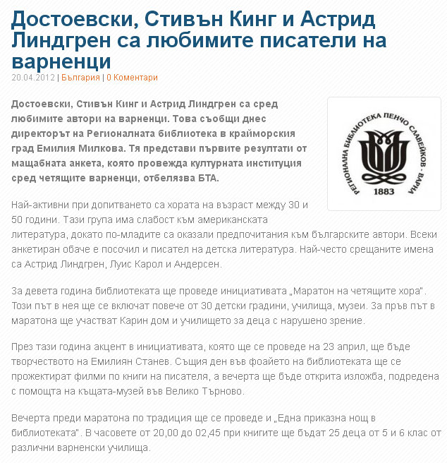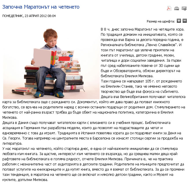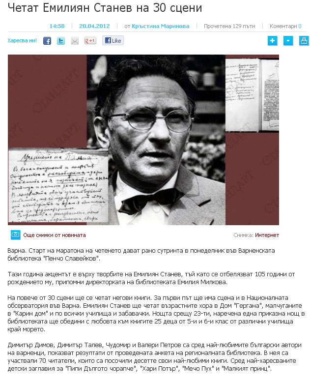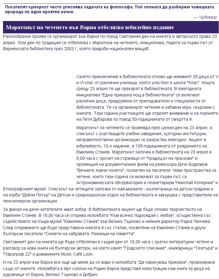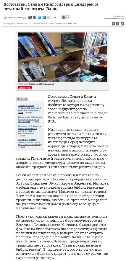 Маратон на четящите хора във Варна // More.bnt.bg [електронен ресурс], 20 април 2012