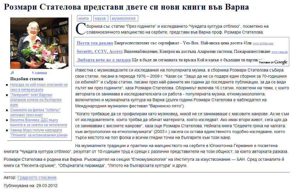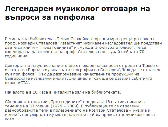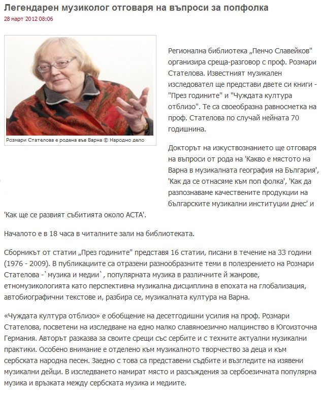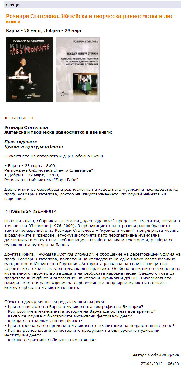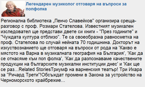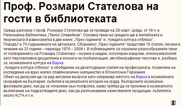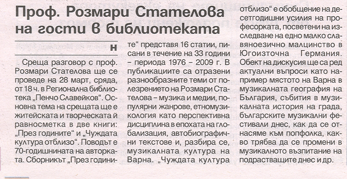 Среща-разговор и представяне на две книги ("През годините" и "Чуждата култура отблизо") по повод 70-годишнината на авторката. |