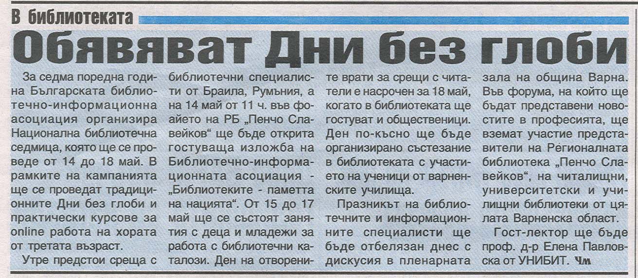Регионална библиотека "П. Славейков" отбелязва празника на библиотечните специалисти. Инициативи в рамките на Националната библиотечна седмица. |