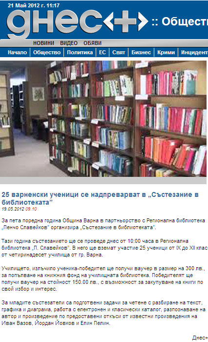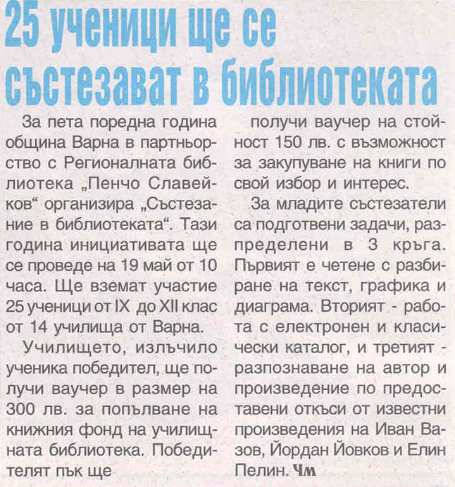 Пето издание на "Състезание в библиотеката", организирано от Община Варна в партньорство РБ "Пенчо Славейков". |