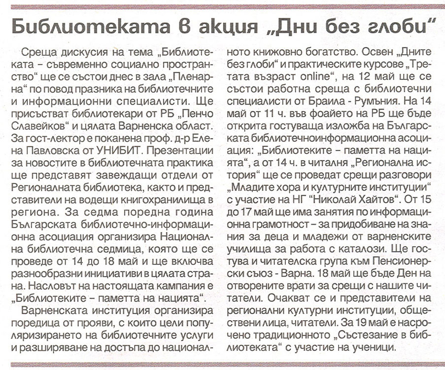 Регионална библиотека "П. Славейков" организира среща дискусия на тема "Библиотеката - съвременно социално пространство". Предстоящи прояви през Националната библиотечна седмица. |