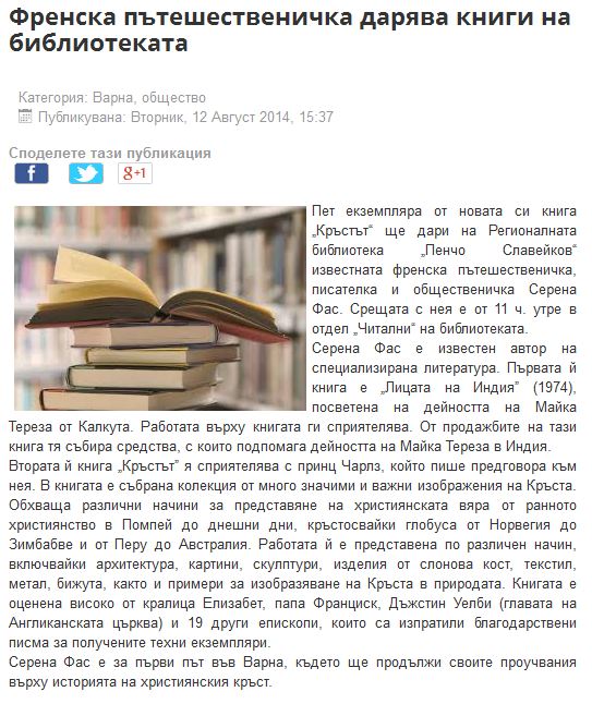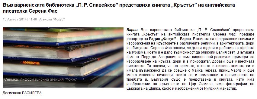 Във варненската библиотека „П. Р. Славейков” представиха книгата „Кръстът” на английската писателка Серена Фас. // Focus-news.net/, 13 август 2014 |