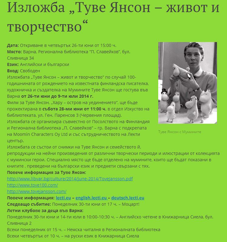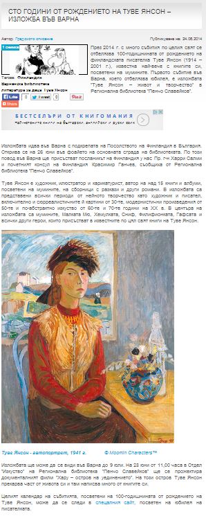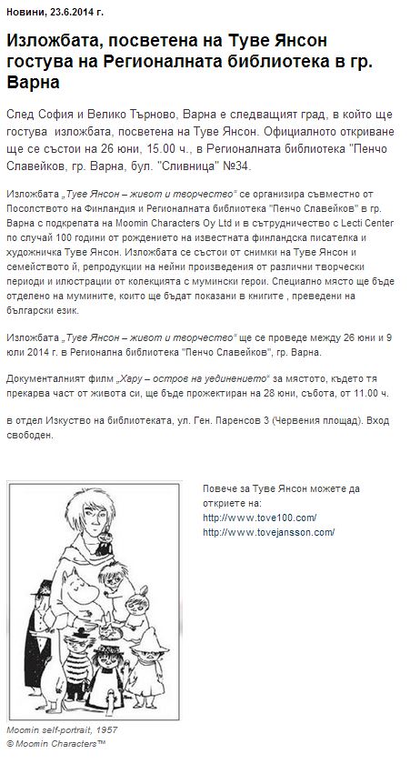 Изложбата, посветена на Туве Янсон гостува на Регионалната библиотека в гр. Варна. // Finland.bg, 23 юни 2014 |