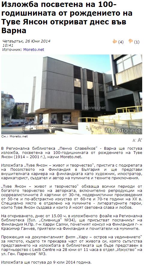 Изложба посветена на 100-годишнината от рождението на Туве Янсон откриват днес във Варна. // Moreto.net, 26 юни 2014 |