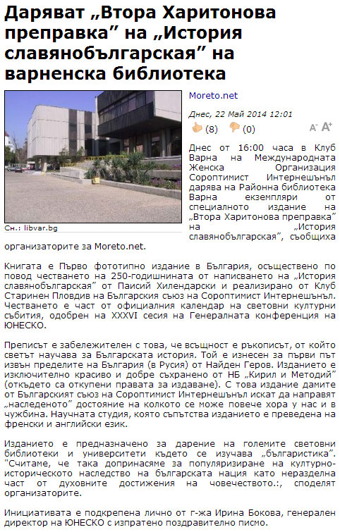 Даряват „Втора Харитонова преправка” на „История славянобългарская” на варненска библиотека. // Moreto.net, 22 май 2014 |