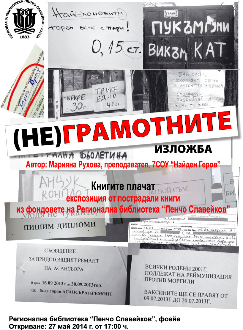 Изложбата акцентира върху грамотността като представя фотоси на обяви и надписи с граматически грешки. Предназначена за учениците в 7СОУ “Найден Геров”, експозицията предизвиква размисъл върху темата “колко сме грамотни”, но и с чисто визуални средства постига педагогически цели, като представя правилното изписване на думите и кара зрителя да запомни често срещани грешки.