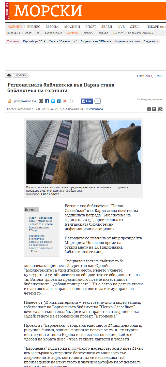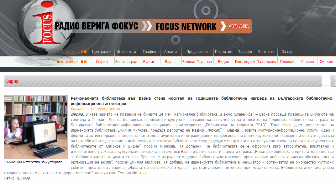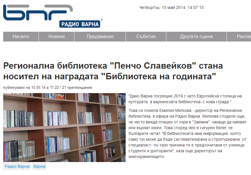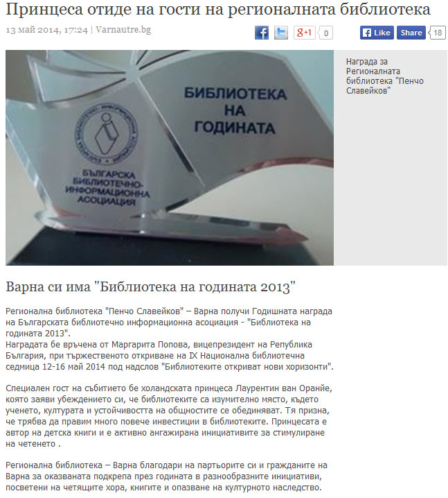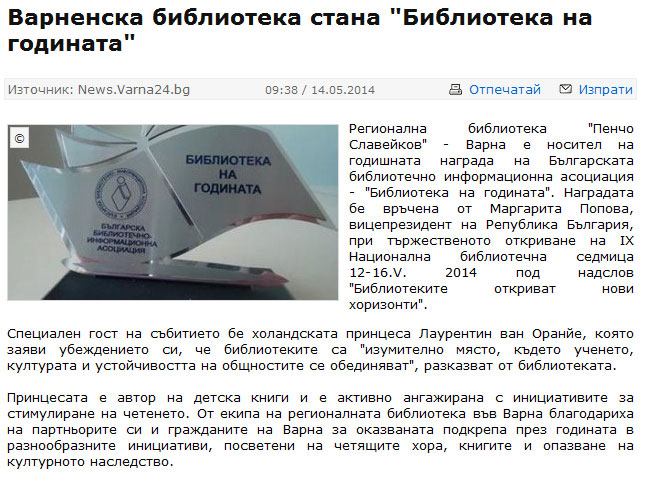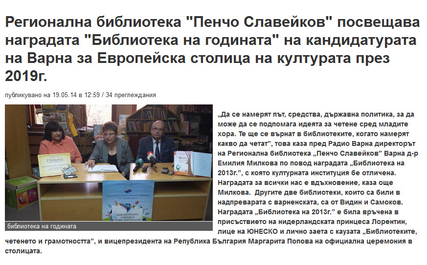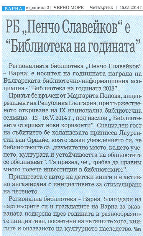 Регионална библиотека "Пенчо Славейков" бе удостоена с Годишната библиотечна награда на Българската библиотечно-информационна асоциация в категорията "Библиотека на годината 2013". Наградата бе връчена официално от вицепрезидента на Република България г-жа Маргарита Попова на тържественото откриване на Деветата национална библиотечна седмица. Специален гост на събитието беше принцесата на Нидерландия Лаурентин - авторка на детски книжки и лично ангажирана с инициативите за стимулиране на четенето.